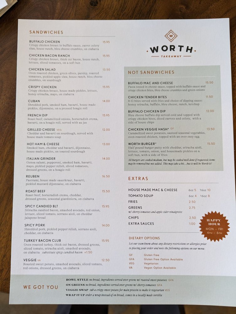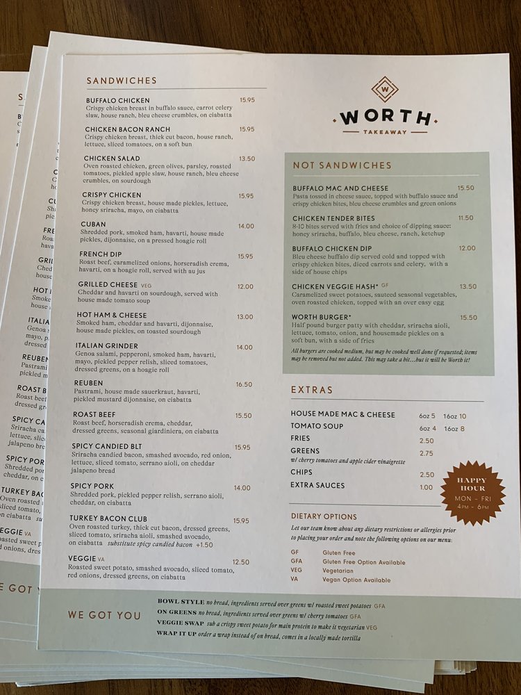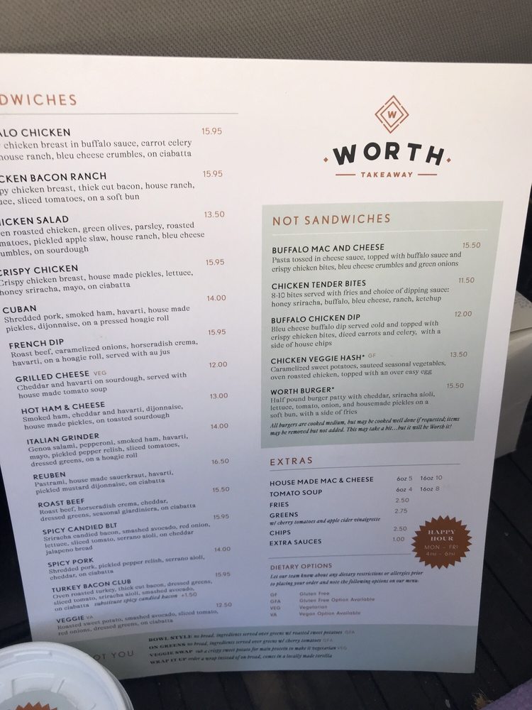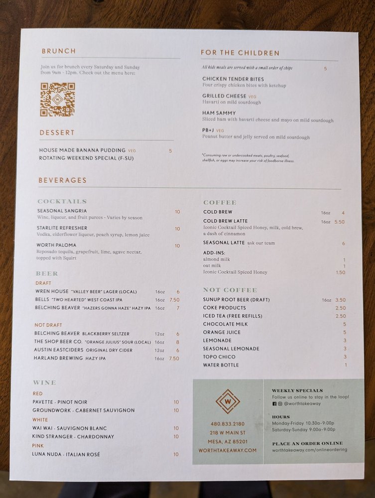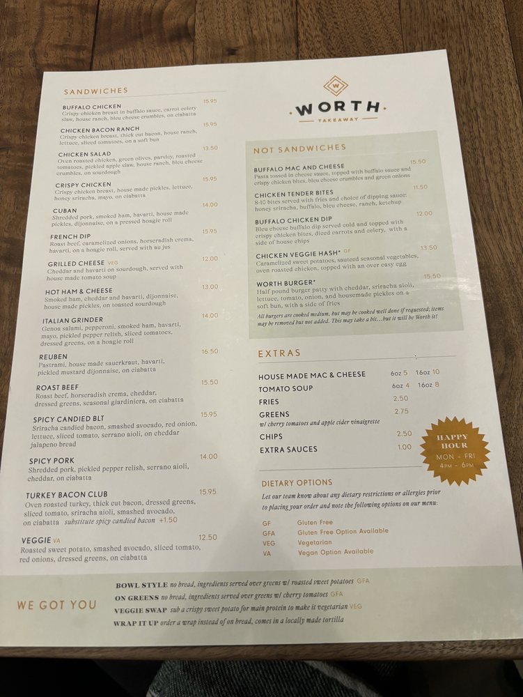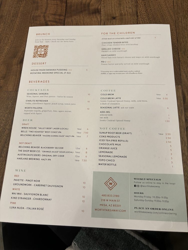 Worth Takeaway, located in Mesa, AZ, is a trendy sandwich shop offering a variety of delicious options. The menu features unique sandwiches like the spicy pork and spicy candied BLT, praised for their bold flavors. Customers rave about the Cajun-seasoned French fries and house-made chips that come as sides. The restaurant is known for its friendly service and cozy atmosphere, making it a popular choice for breakfast, brunch, and lunch. Worth Takeaway also offers catering, outdoor seating, and a full bar. If you're in the area, don't miss out on their specials, which are sometimes only listed on their Instagram account. Whether you're in the mood for a crispy chicken sandwich or a classic Reuben, Worth Takeaway is a must-try spot in the Valley.